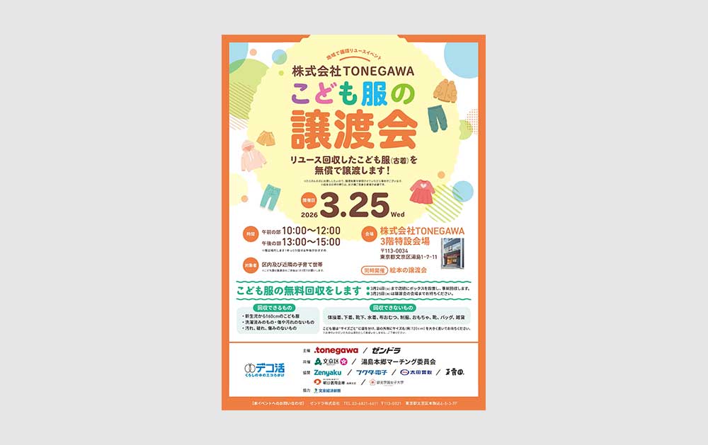 このたび株式会社TONEGAWAでは、地域の子育て家庭を支援するとともに、衣類のリユースを通じた環境負荷の軽減を目的として、「こども服譲渡会」を開催いたします。