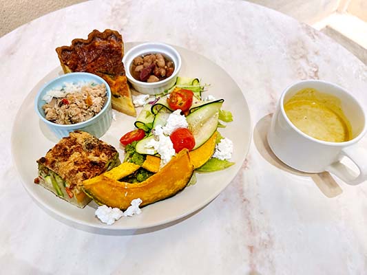 毎日のように足を運ばれるお客様が結構いらっしゃるので、いろいろな引き出しを見てただきたいと思います。野菜とタンパク質をバランス良く摂れるランチメニューです。キッシュは唯一毎日用意しておりますが、中の具材や、付け合わせはバラエティに富んでいます。