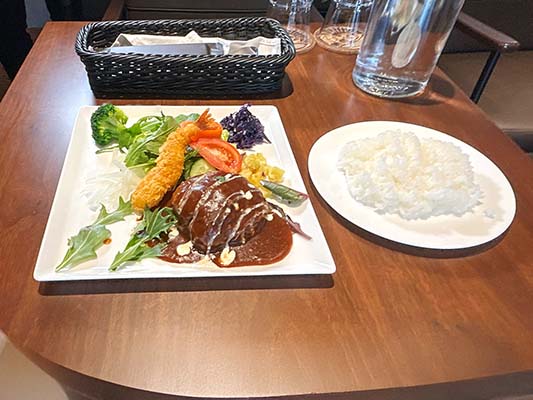 ハンバーグステーキが最も注文が多いですね。ランチではご飯とコーヒー、サラダ、そしてエビフライがついてきます。ちなみにお米は標高300mの棚田で作った魚沼産のコシヒカリで、湧き水と雨水だけで作られています。